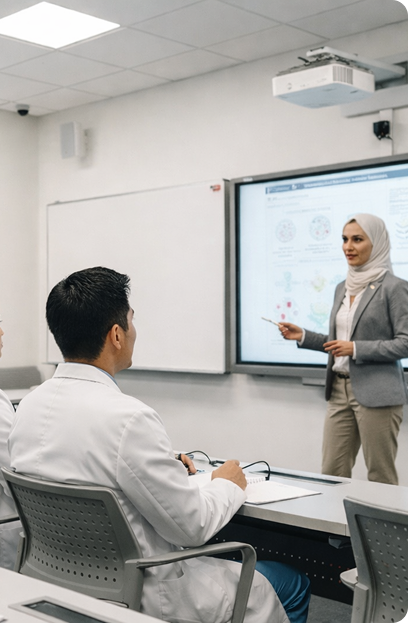 نولي نموك المهني أولوية قصوى؛ لذا نوفّر فرصاً واسعة للتطوير المهني عبر أكثر من 200 برنامج تدريبي تخصصي يحظى العديد منها باعتمادات دولية وتفرد على مستوى المنطقة. يمكنك الاستفادة من نظام إدارة التعلم "iLearn" للتعلم الإلكتروني المستمر، والمشاركة في أنشطة التعليم الطبي المستمر، واستخدام المكتبة الرقمية للعلوم الصحية التي تعدّ المرجع الأول للممارسين الصحيين في المنطقة. وللموظفين الدوليين، نقدّم دعماً شاملاً يشمل تسهيلات الانتقال، والتهيئة الثقافية، والمساندة في إجراءات التأشيرات والمعاملات الحكومية. التزامنا بنجاحك يبدأ من يومك الأول معنا، ويلازمك في كل محطة من رحلتك المهنية.