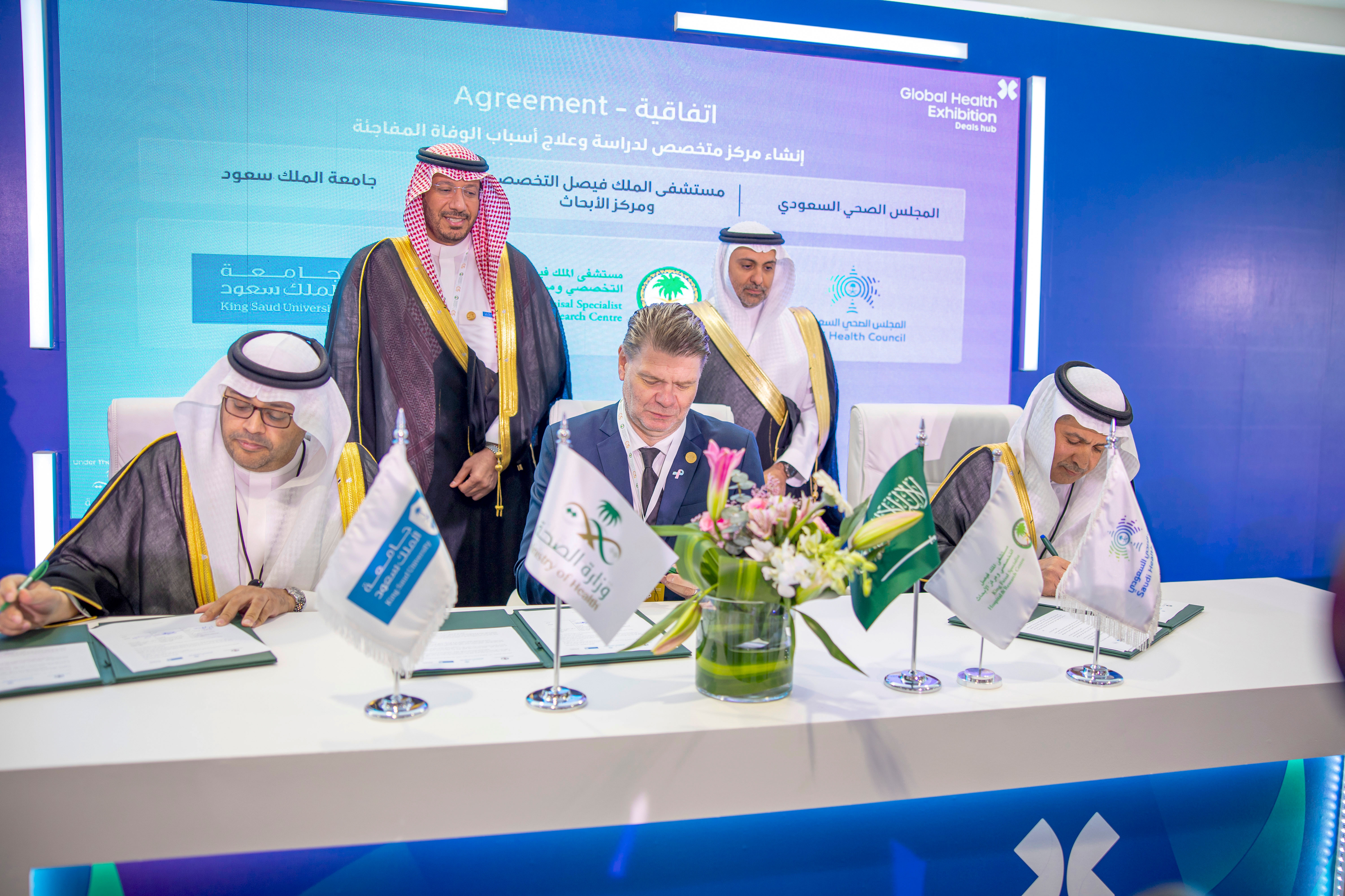 وفي خطوة نوعية لتعزيز التكامل في الصحة الوقائية، وقّع التخصصي اتفاقية تعاون مع جامعة الملك سعود والمجلس الصحي السعودي، لتعزيز العمل المشترك في مجالات الصحة العامة والوقاية من الأمراض ومكافحتها، والحد من الاصابات وتبادل الخبرات في المجالات العلمية والبحثية، والتعاون لإنشاء سجل وطني للوفاة المفاجئة.